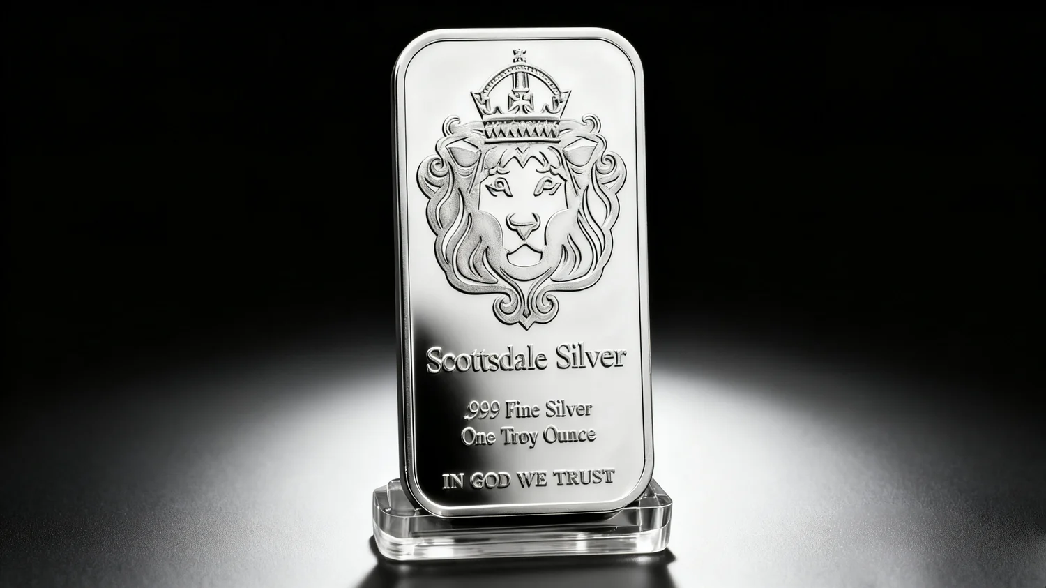 The bar's front features the iconic Scottsdale crowned lion-a symbol of strength and trust-at its center. Surrounding the lion: inscriptions like"Scottsdale Silver",".999 Fine Silver","One Troy Ounce", and"In God We Trust". Every detail honors the mint's commitment to legacy and American heritage.