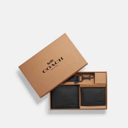 Sport calf leather Eight credit card slots Full-length bill compartments Removable insert with ID window and two credit card slots 4 1/4 (L) x 3 3/4 (H) x 3/4 (W) Trigger valet key fob included Packaged in a gift box Style No. 64118 | Outlet Boxed 3 In 1 Wallet Gift Set - Brown