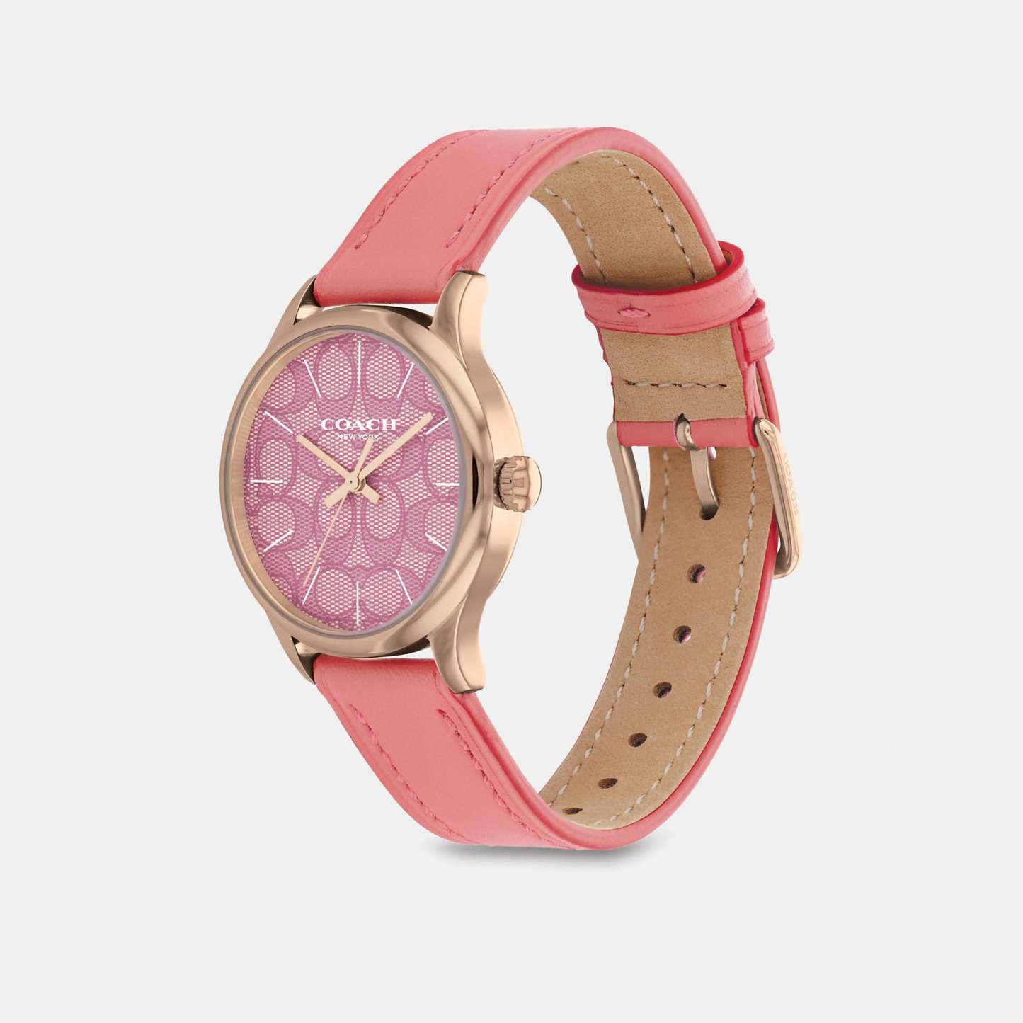 Carnation gold tone case and leather strap Approx. case diameter - 32mm Mineral crystal Quartz movement Buckle closure Water-resistant to 99 feet Style No. C9571 | Outlet Ruby Watch, 32 Mm - Pink