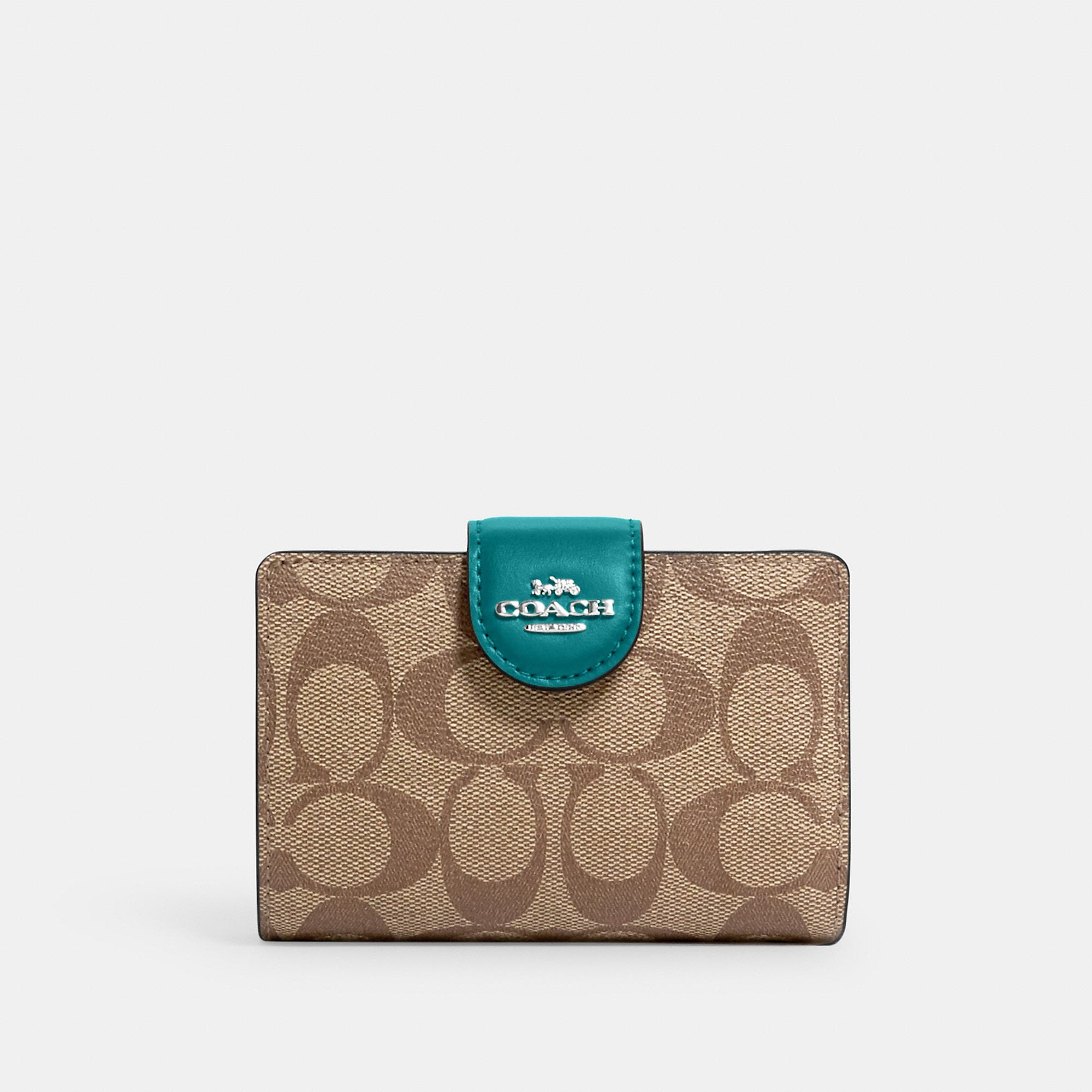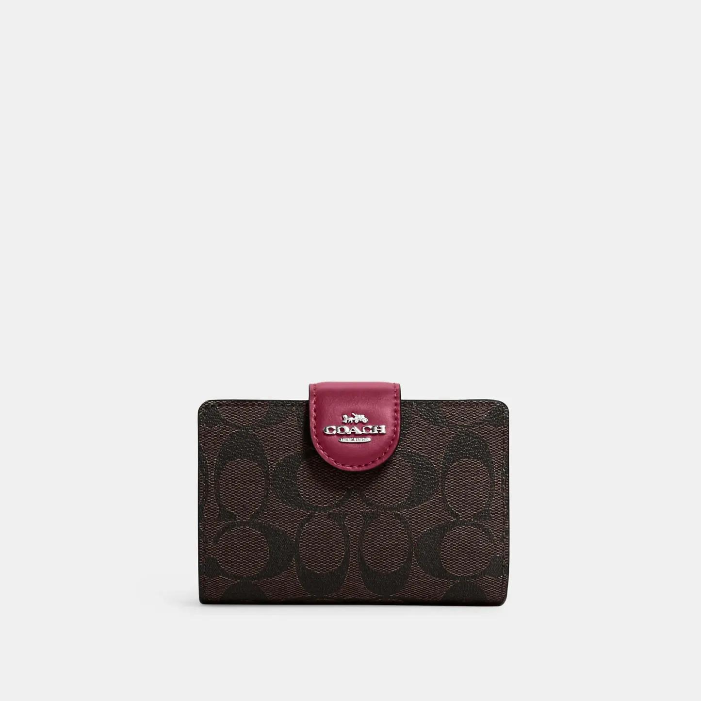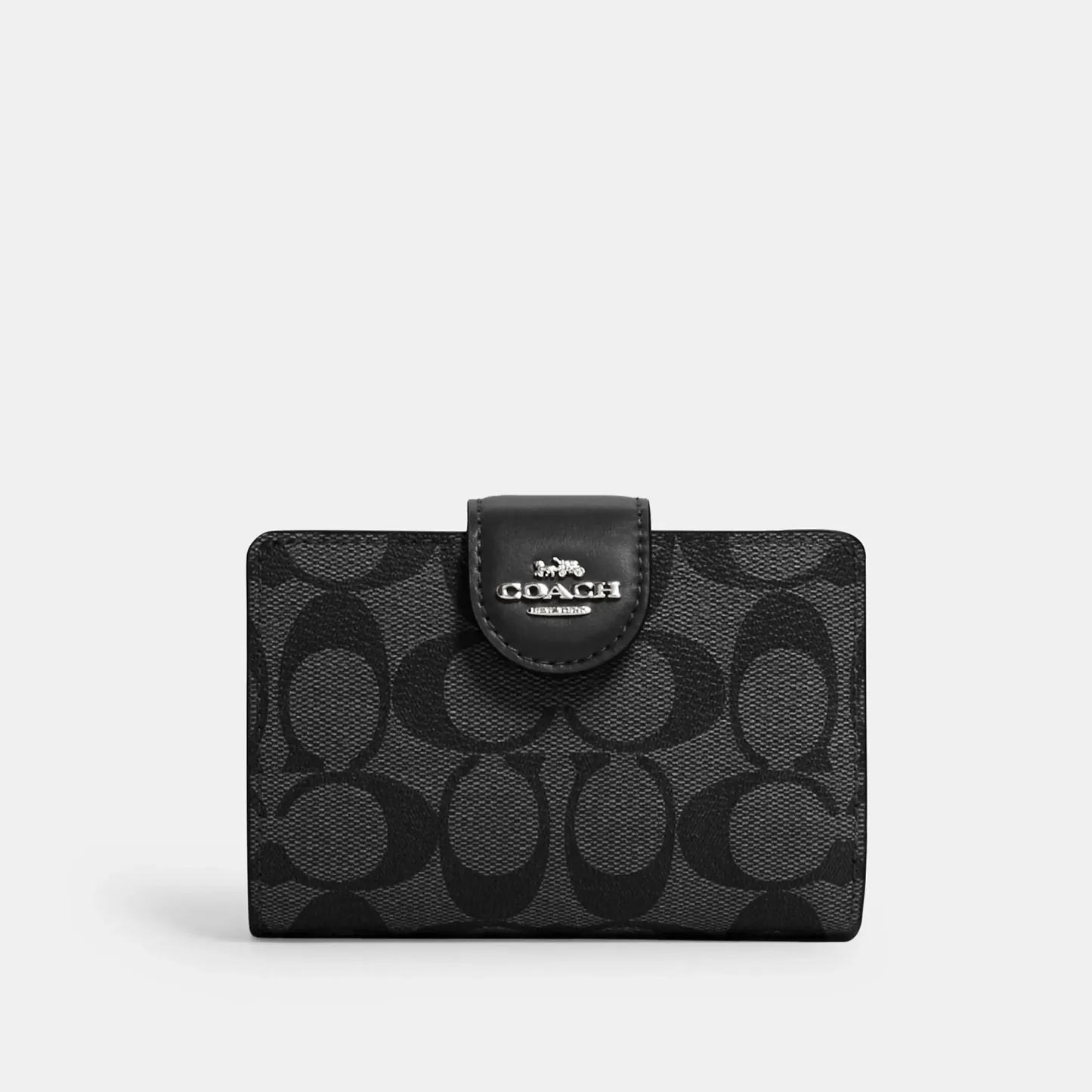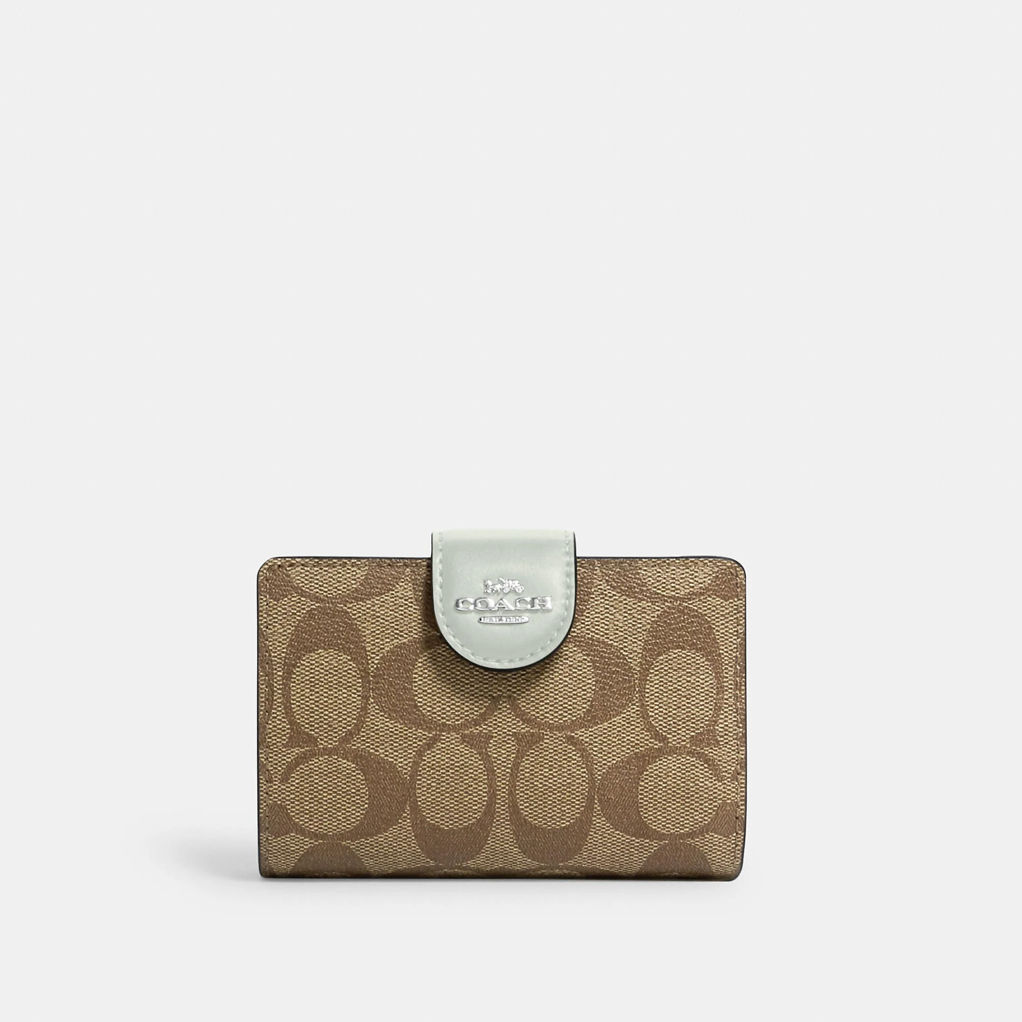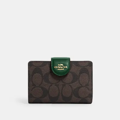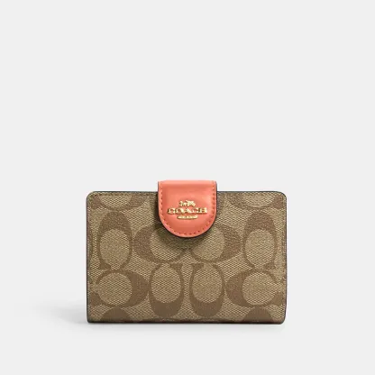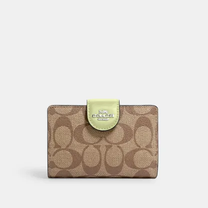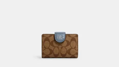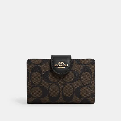 Signature coated canvas and smooth leather Seven credit card slots Bill compartment ID window Snap closure Zip coin pocket 5 (L) x 3 1/2 (H) x 1/2 (W) Style No. C0082