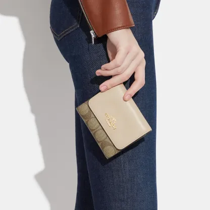 Signature coated canvas and smooth leather Two credit card slots Full-length bill compartment ID window Zip coin pocket Snap closure Outside open pocket 4 1/4 (L) x 4 (H) Style No. CE930 | Outlet Small Trifold Wallet In Blocked Signature Canvas - Multi