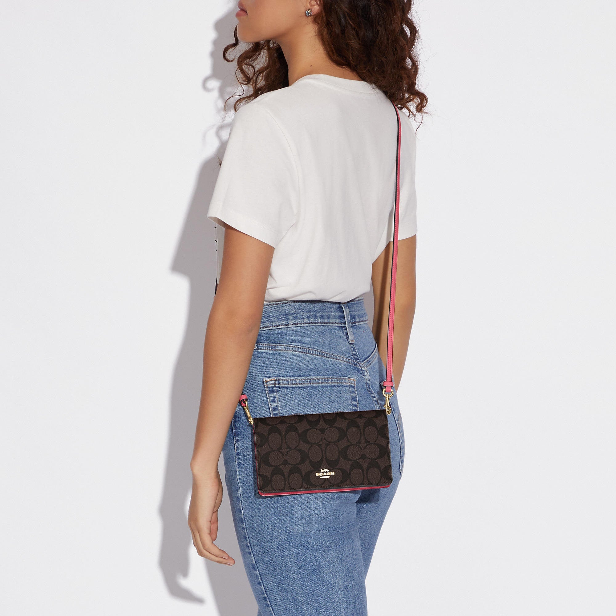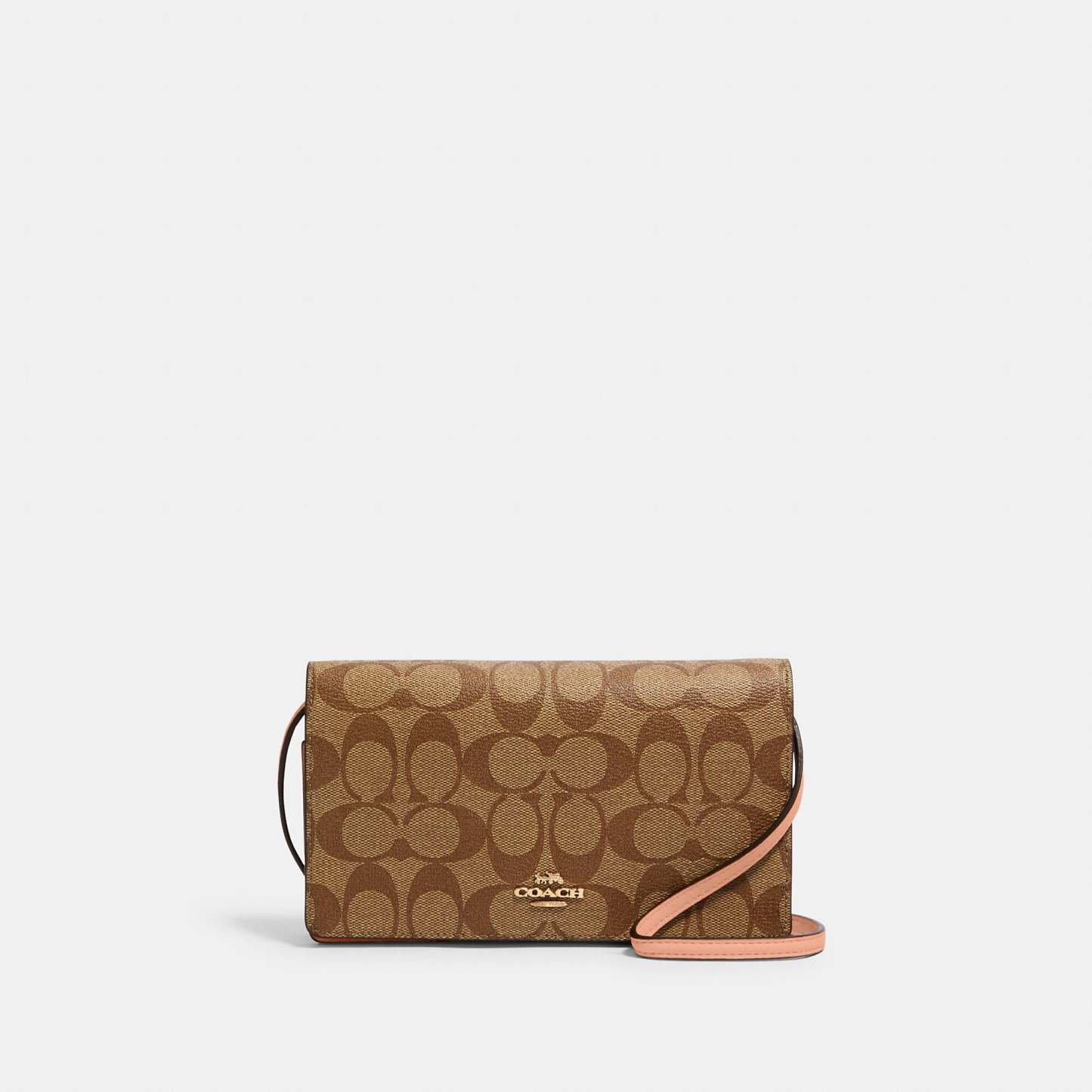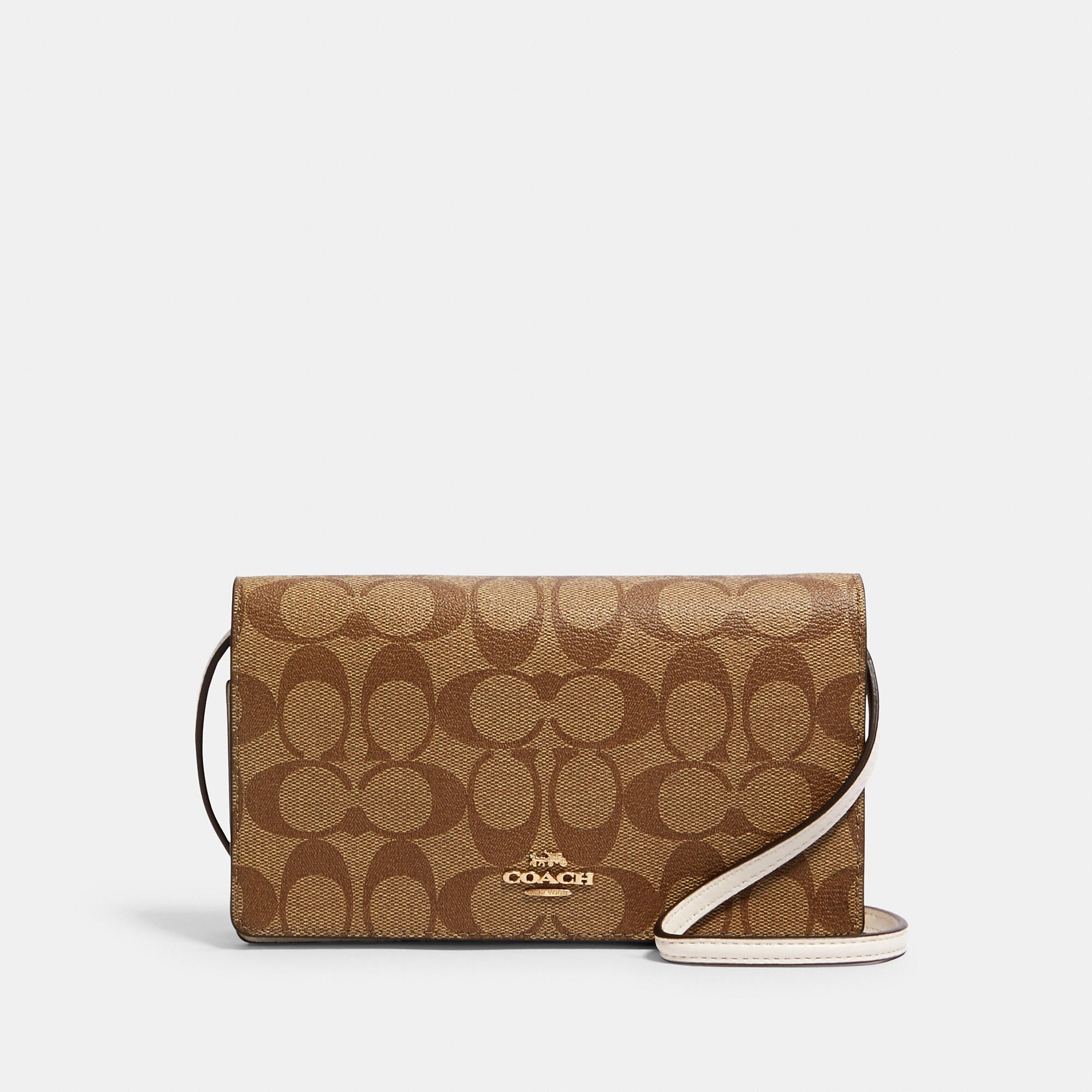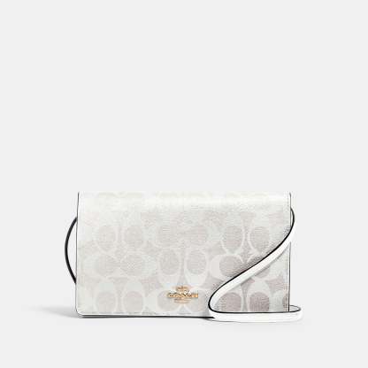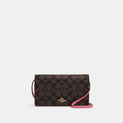 Signature coated canvas and smooth leather Eight credit card slots Full-length bill compartment Inside zip pocket Snap closure Outside slip pocket Detachable strap with 23 drop for shoulder or crossbody wear 8 (L) x 4 3/4 (H) x 1 1/2 (W) Style No. 3036