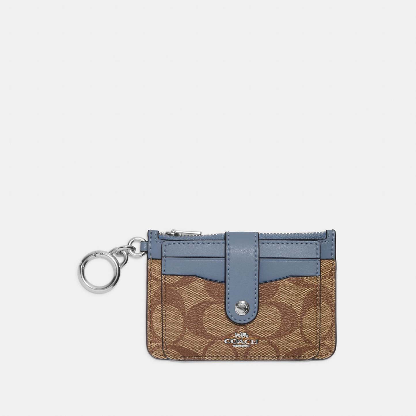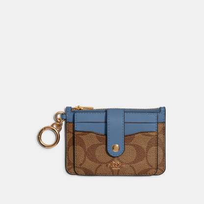 Signature coated canvas and smooth leather Three credit card slots ID window Snap closure Zip compartment Attached hinged key ring 4 3/4 (L) x 3 (H) Style No. C7398