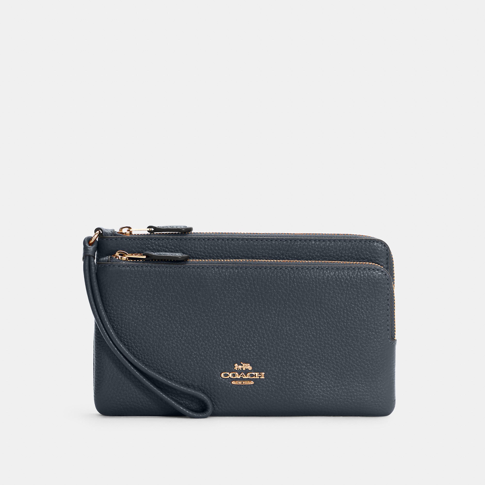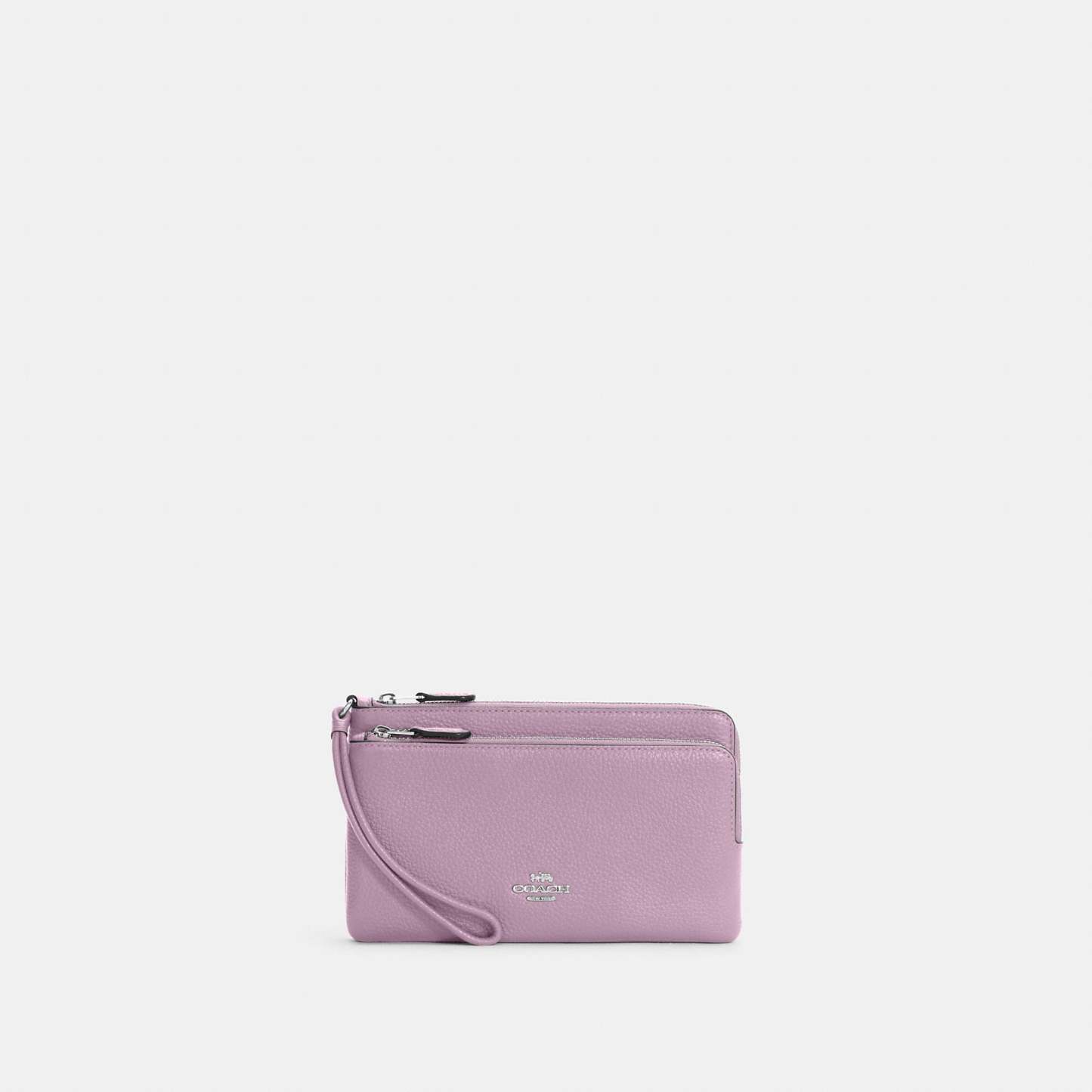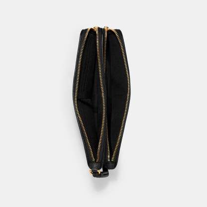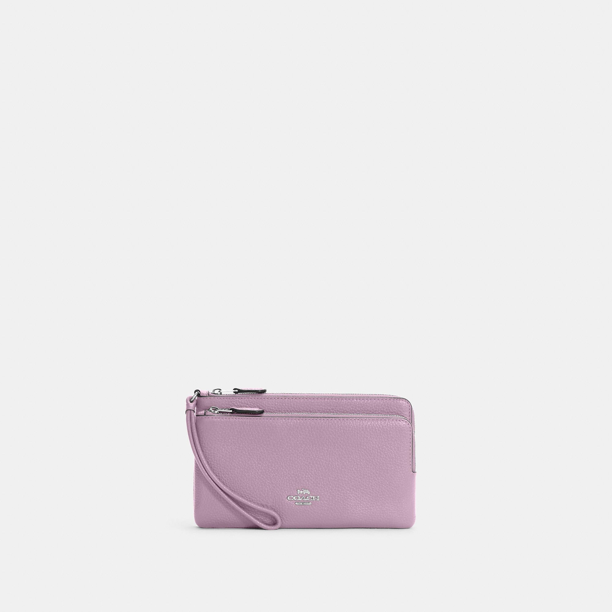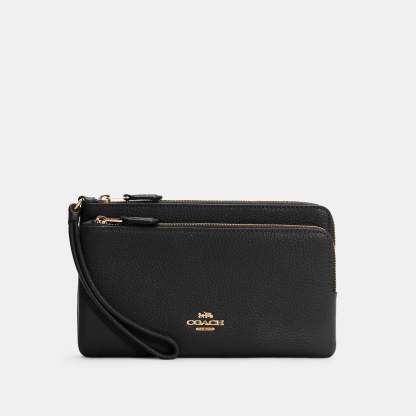 Refined pebble leather Eight credit card slots Inside open pockets Double zip closure fabric lining Wrist strap attached 8 (L) x 4 3/4 (H) x 1 (W) Fits all phone sizes up to an iPhone X and Samsung S7 Edge Style No. C5610 | Outlet Double Zip Wallet - Black