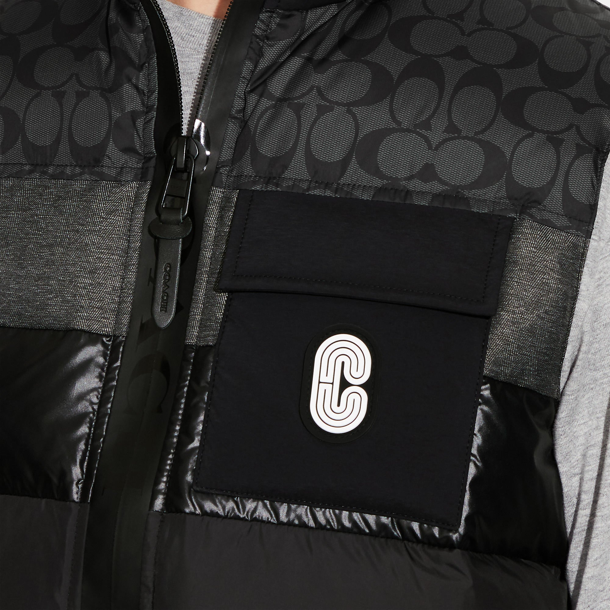 100% polyester Trim - 79% nylon 21% polyester Lining - 100% polyester Leather details Zip closure Zip and flap pockets Length - 28 1/4 Style No. C5036