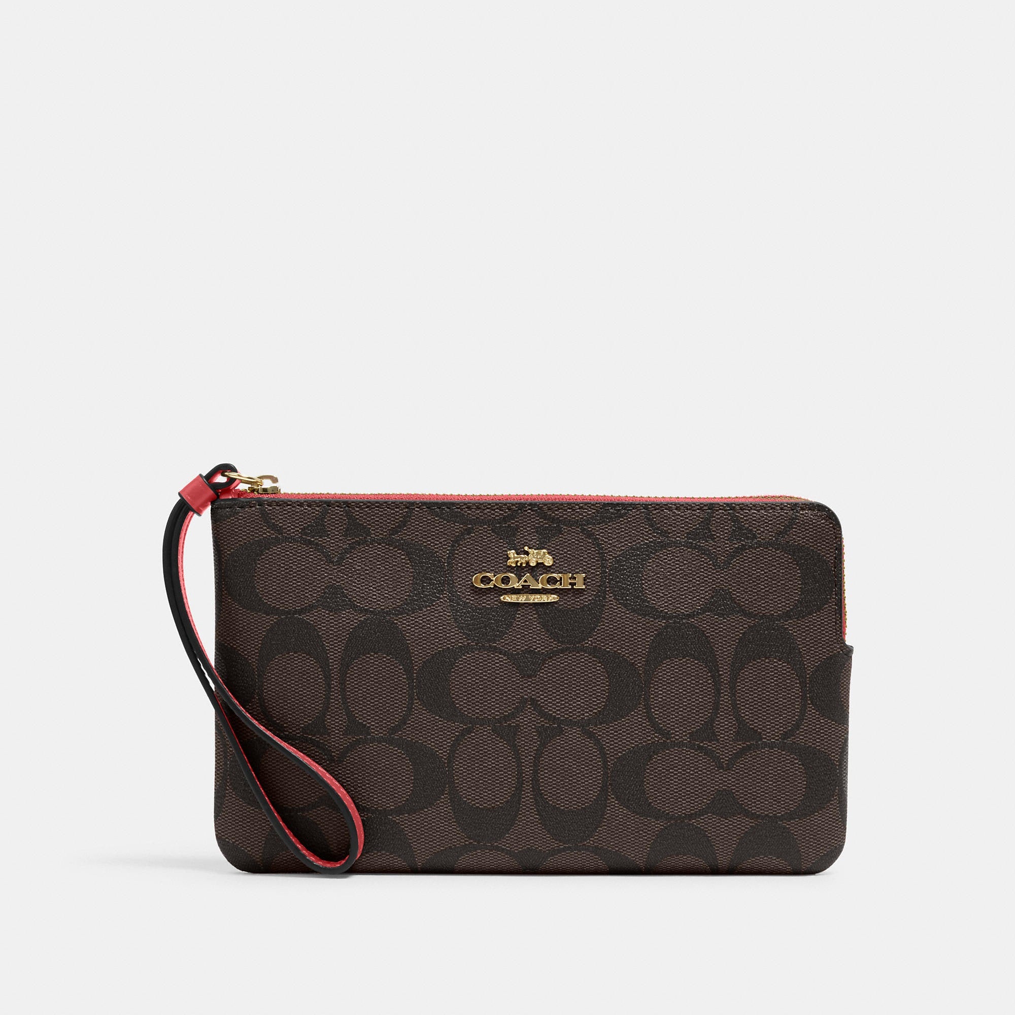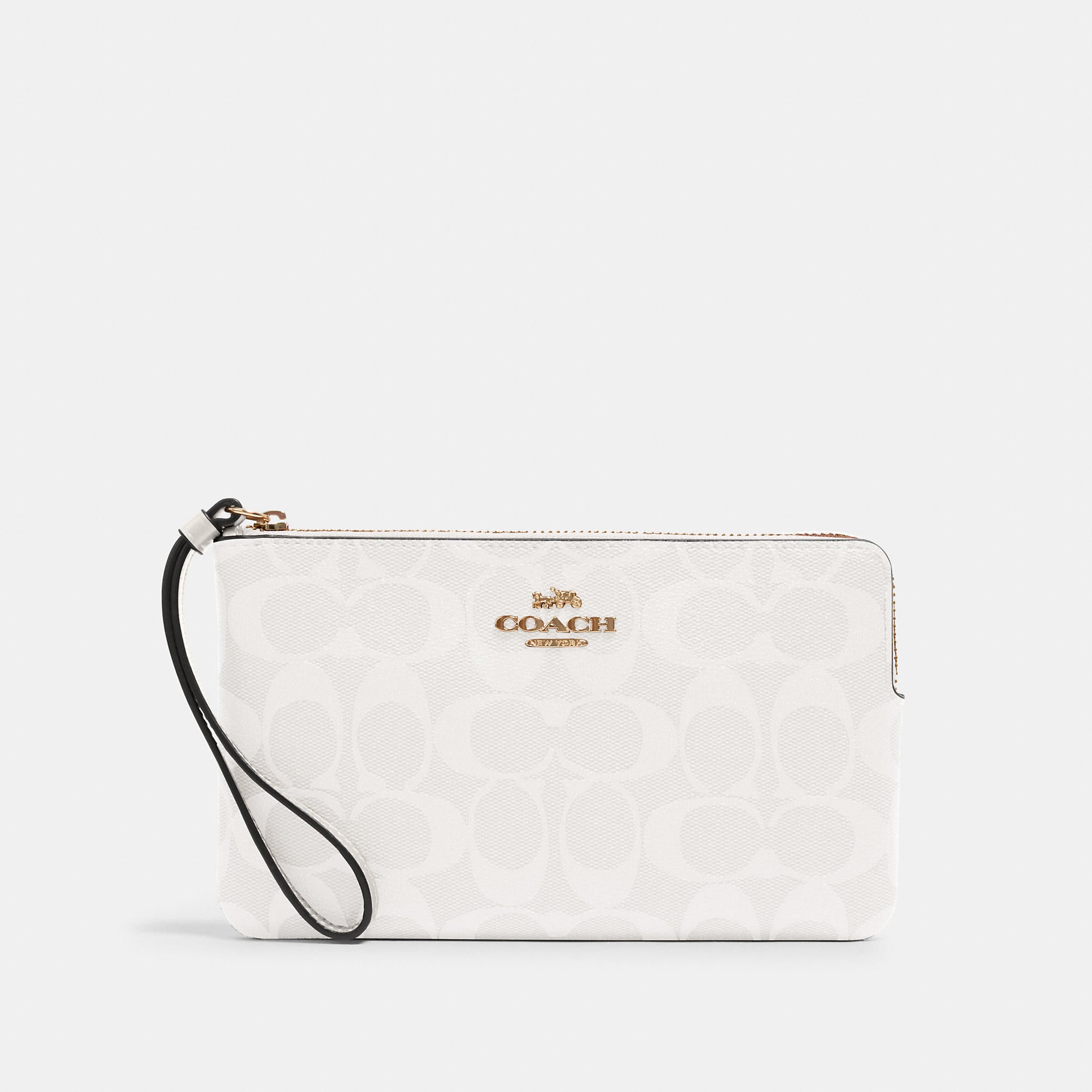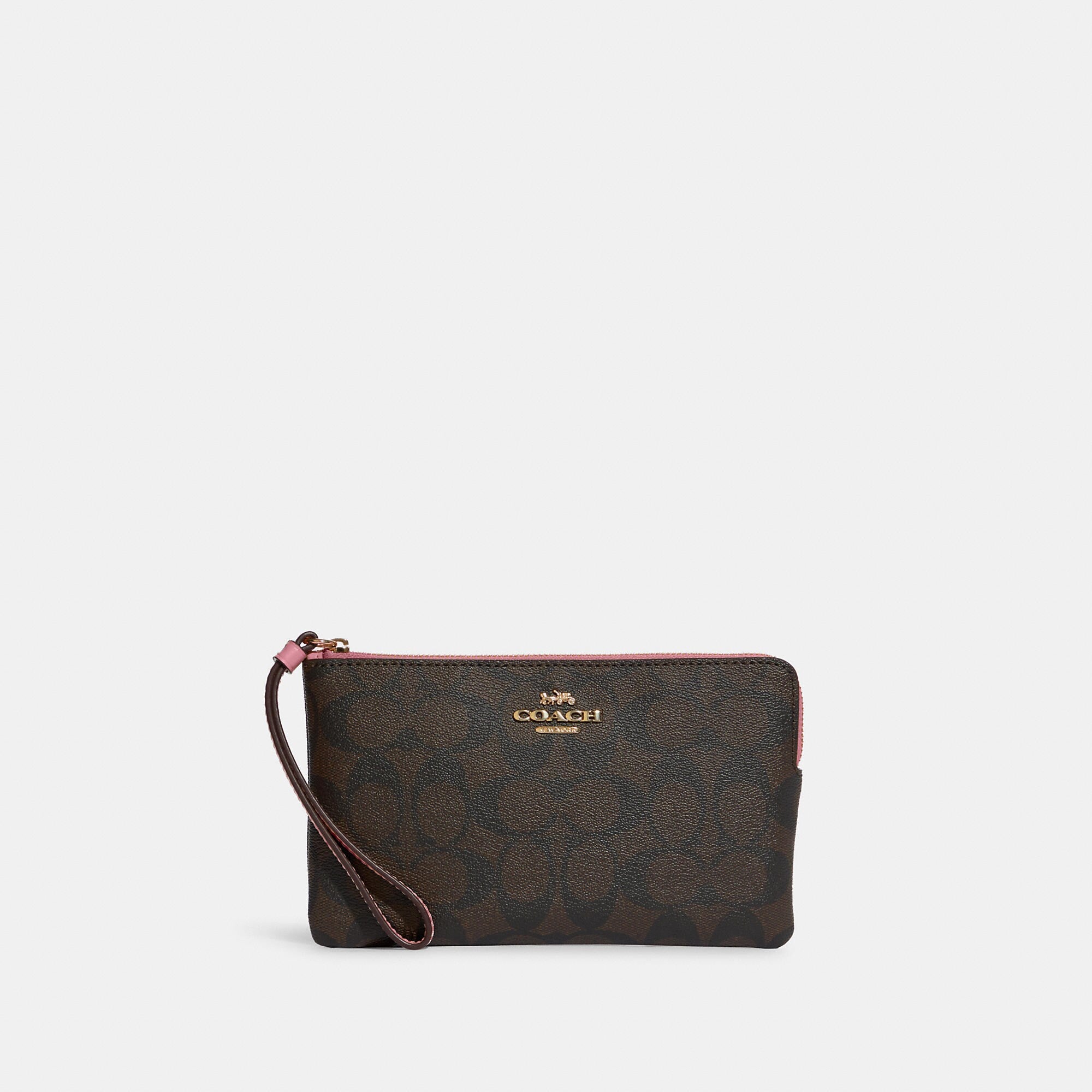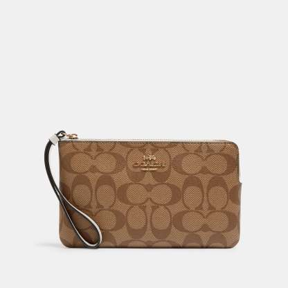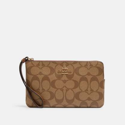 Signature coated canvas and smooth leather Two credit card slots Zip closure fabric lining Wrist strap attached 7 3/4 (L) x 4 3/4 (H) x 1/2 (W) Style No. 6648 | Outlet Large Corner Zip Wristlet In Signature Canvas - Beige