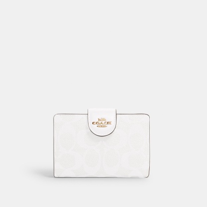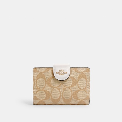Signature coated canvas and smooth leather Seven credit card slots Bill compartment ID window Snap closure Zip coin pocket 5 (L) x 3 1/2 (H) x 1/2 (W) Style No. C0082