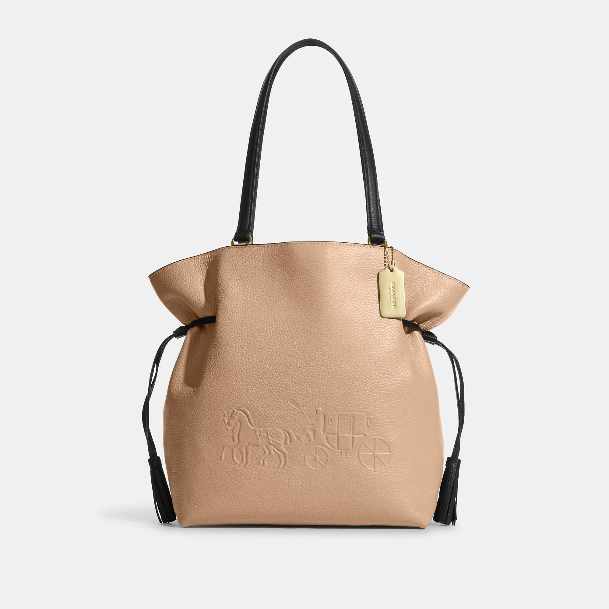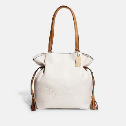 Refined pebble leather Inside zip cell phone and multifunction pockets Drawstring and magnetic snap closures fabric lining Handles with 10 1/4 drop 11 3/4 (L) x 11 1/4 (H) x 5 1/2 (W) Style No. CA165 | Outlet Andy Tote With Horse And Carriage - White