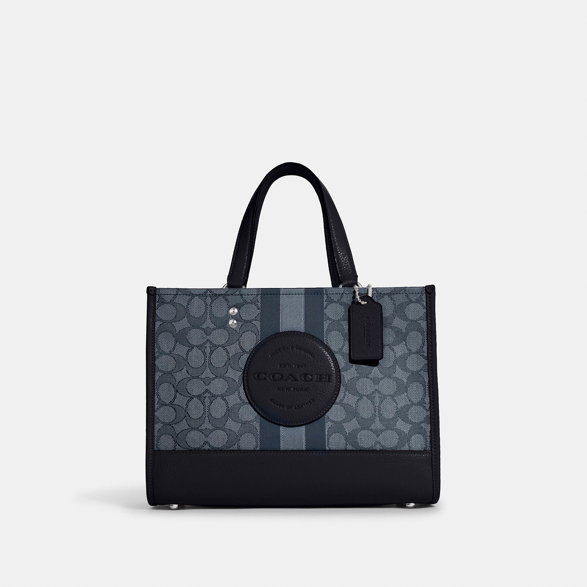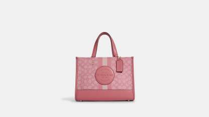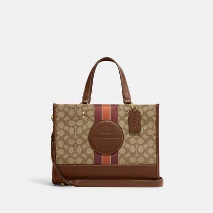 Signature jacquard and refined pebble leather Inside zip cell phone and multifunction pockets Snap closure fabric lining Handles with 5 1/4 drop Detachable strap with 20 drop for shoulder or crossbody wear 11 1/2 (L) x 8 3/4 (H) x 5 (W) This piece is crafted of our Signature jacquard made from a blend of organic cotton and recycled polyester Style No. C8448 | Outlet Dempsey Carryall In Signature Jacquard With Stripe And Patch - Red