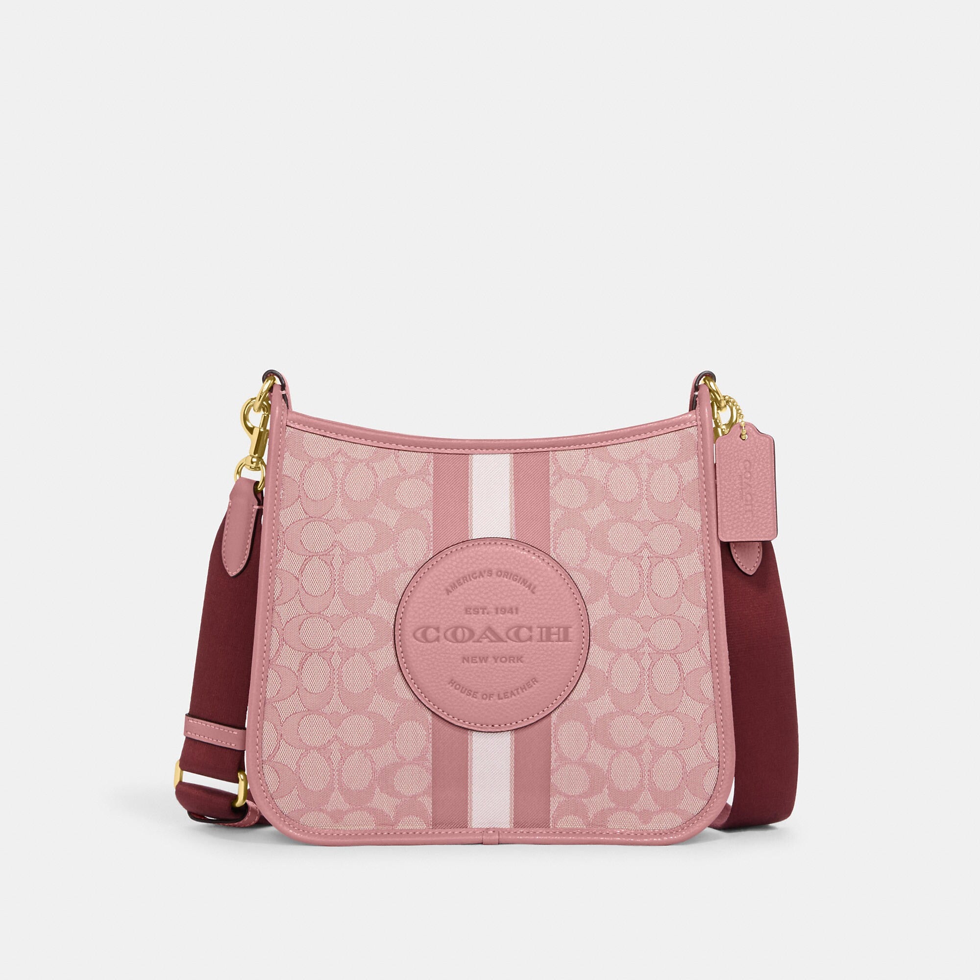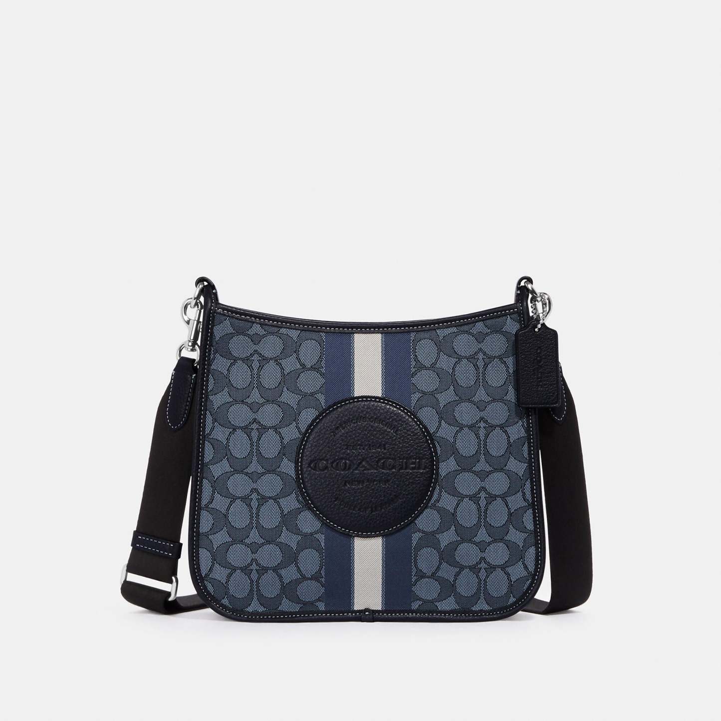 Signature jacquard and refined pebble leather Inside multifunction pocket Zip-top closure fabric lining Outside zip pocket Detachable strap with 25 drop for shoulder or crossbody wear 10 1/2 (L) x 10 (H) x 2 3/4 (W) This piece is crafted of our Signature jacquard made from a blend of organic cotton and recycled polyester Style No. CA195 | Outlet Dempsey File Bag In Signature Jacquard With Stripe And Patch - Blue