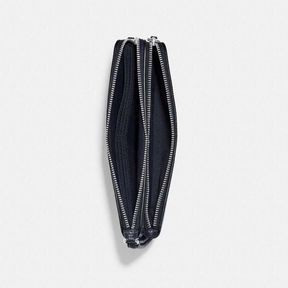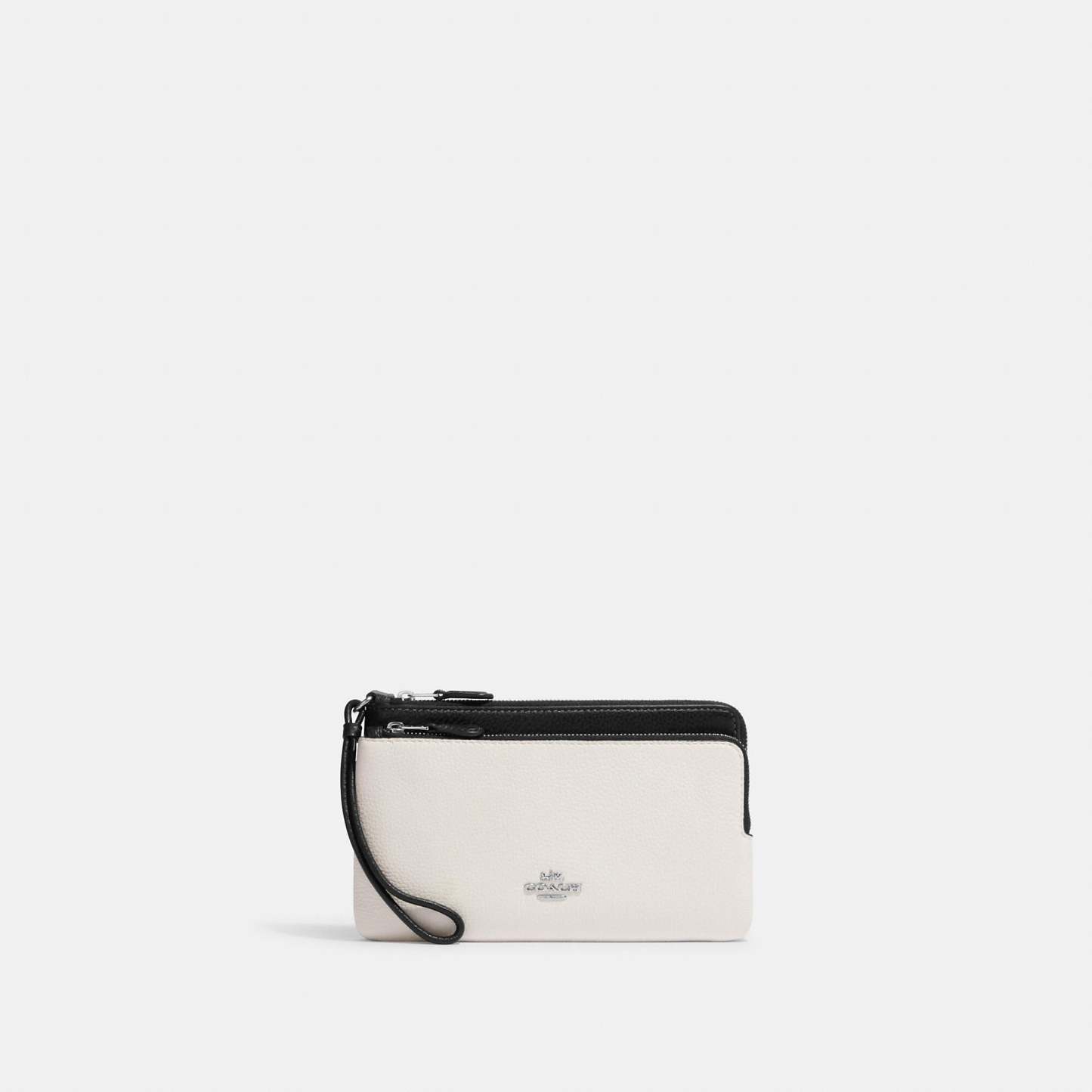 Refined pebble leather Eight credit card slots Inside open pockets Double zip closure fabric lining Wrist strap attached 8 (L) x 4 3/4 (H) x 1 (W) Fits all phone sizes up to an iPhone X and Samsung S7 Edge Style No. CF447