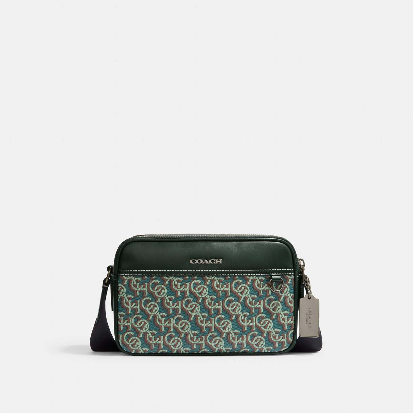 Printed coated canvas and refined calf leather Inside multifunction pockets Double zip closure fabric lining Outside slip pocket Adjustable strap with 25 drop for shoulder or crossbody wear 9 (L) x 5 3/4 (H) x 2 3/4 (W) Style No. CF484 | Outlet Graham Crossbody With Monogram Print - Black