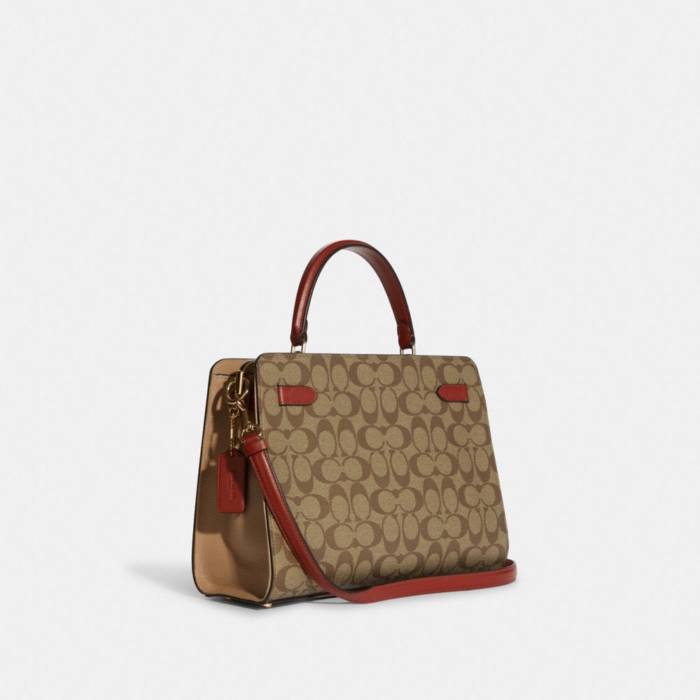 Signature coated canvas refined pebble leather and smooth leather Inside zip and multifunction pockets Snap closures fabric lining Handle with 4 1/4 drop Outside open pocket Detachable strap with 20 1/2 drop for shoulder or crossbody wear Four protective feet at base 12 1/2 (L) x 8 3/4 (H) x 4 3/4 (W) Style No. C8208 | Outlet Lane Carryall In Colorblock Signature Canvas - Multi