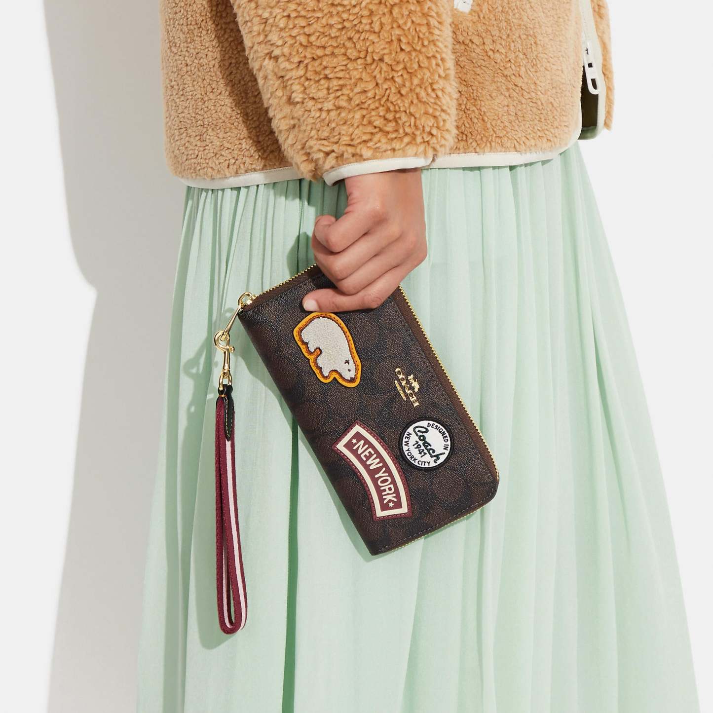 Signature coated canvas and smooth leather Twelve credit card slots Full-length bill compartments Inside zip coin pocket Zip-around closure Detachable wrist strap 7 1/2 (L) x 4 (H) x 1 (W) Fits all iPhone and Samsung Galaxy phones Style No. CE678 | Outlet Long Zip Around Wallet In Signature Canvas With Ski Patches - Multi