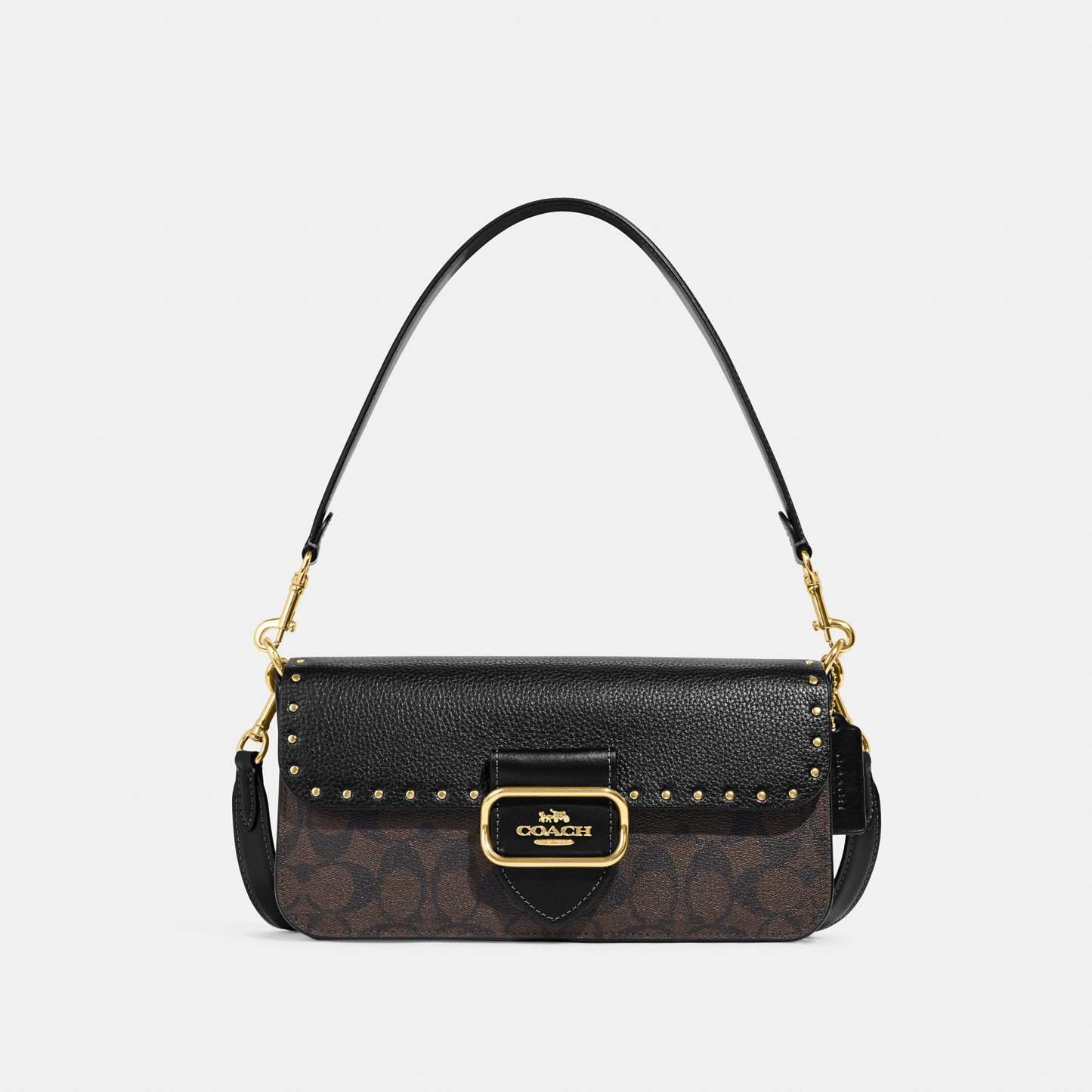 Signature coated canvas refined pebble leather and smooth leather Inside zip and multifunction pockets Snap closure fabric lining Detachable handle with 9 drop Outside open pocket Detachable strap with 21 1/4 drop for shoulder or crossbody wear 10 1/2 (L) x 5 1/2 (H) x 2 1/2 (W) Style No. CE563 | Outlet Morgan Shoulder Bag In Colorblock Signature Canvas With Rivets - Multi