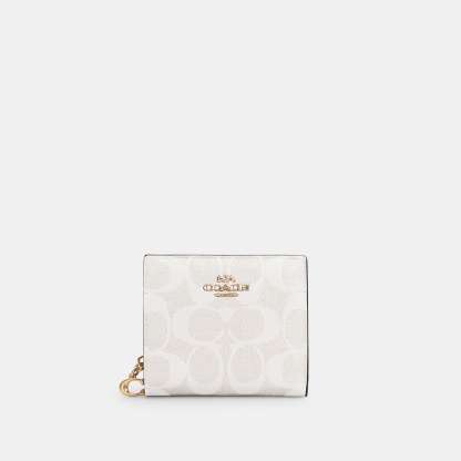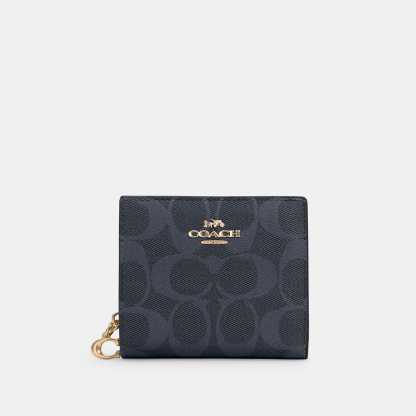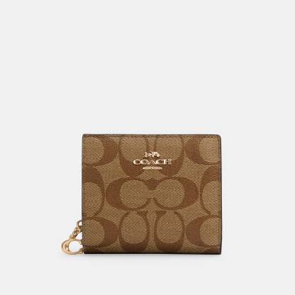 Signature coated canvas and smooth leather Three credit card slots ID window Full-length bill compartment Snap closure Outside zip coin pocket 4 1/4 (L) x 3 1/2 (H) x 1 (W) Style No. C3309