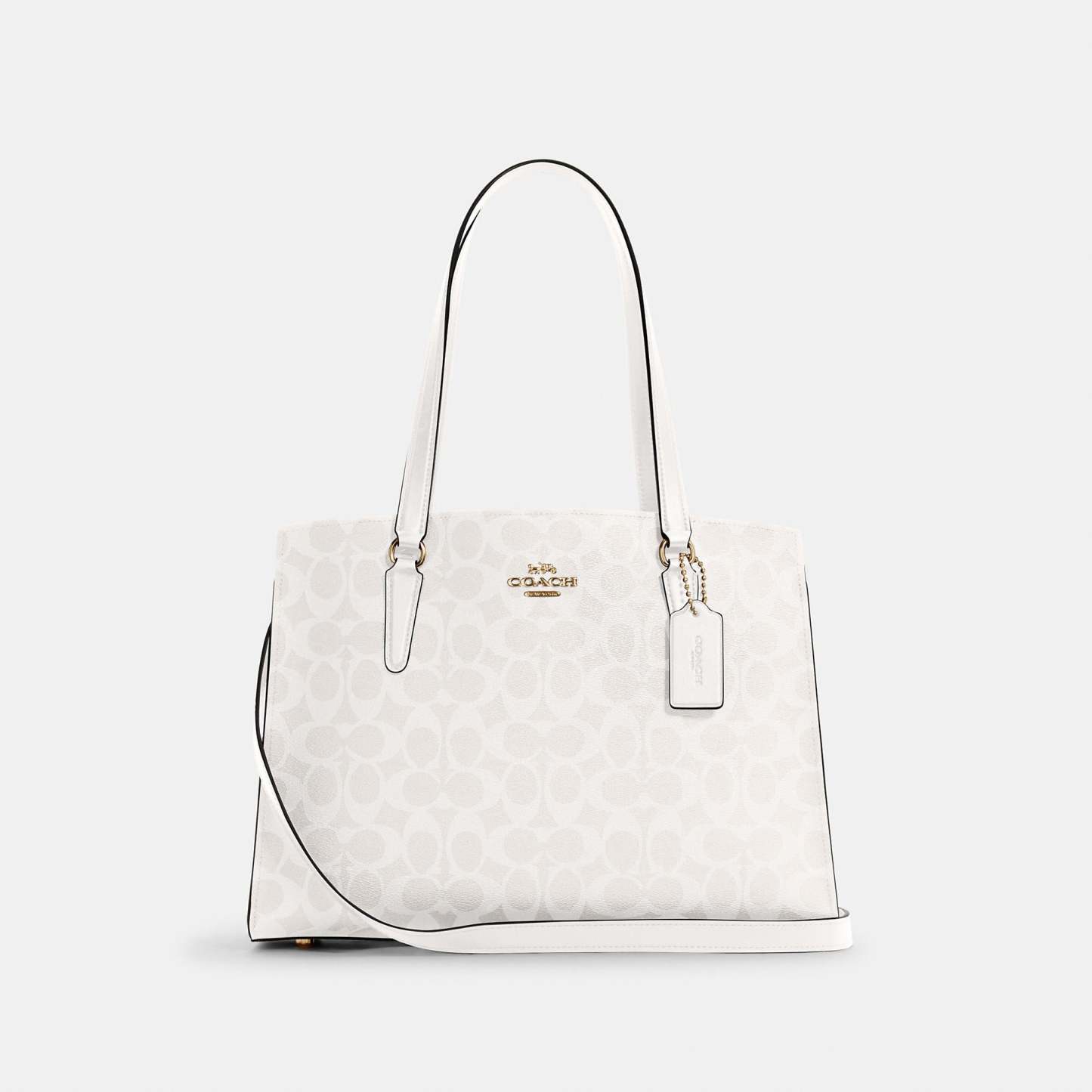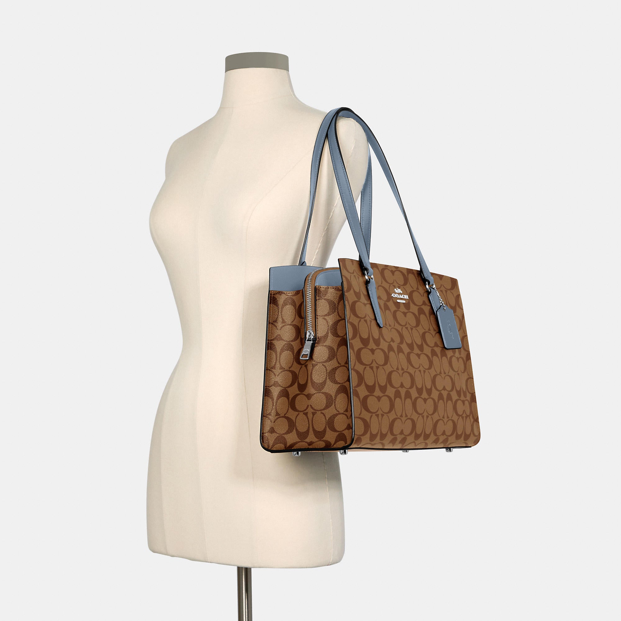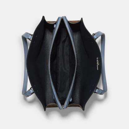 Signature coated canvas and smooth leather Fits a 13 laptop Inside cell phone and multifunction pockets Zip closure fabric lining Side open compartments Handles with 9 drop Detachable strap with 19 1/2 drop for shoulder or crossbody wear Four protective feet at base 13 3/4 (L) x 10 1/4 (H) x 5 3/4 (W) Style No. C4075