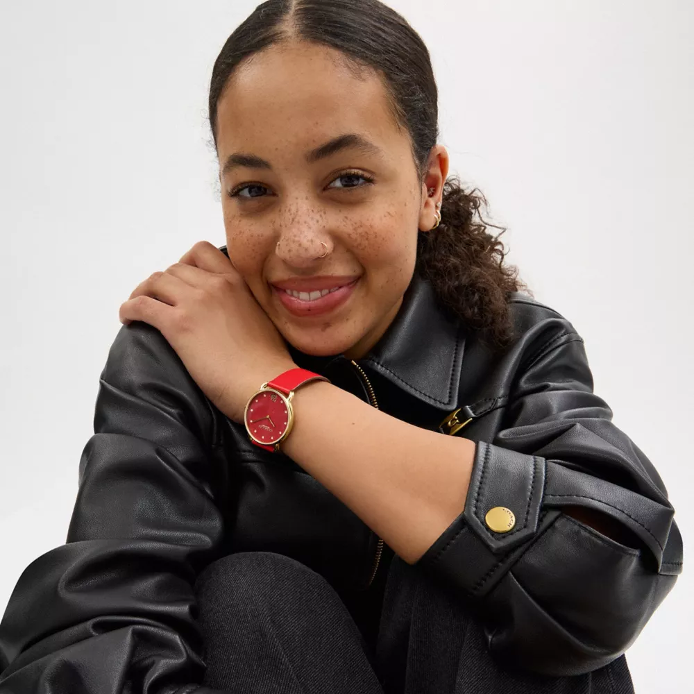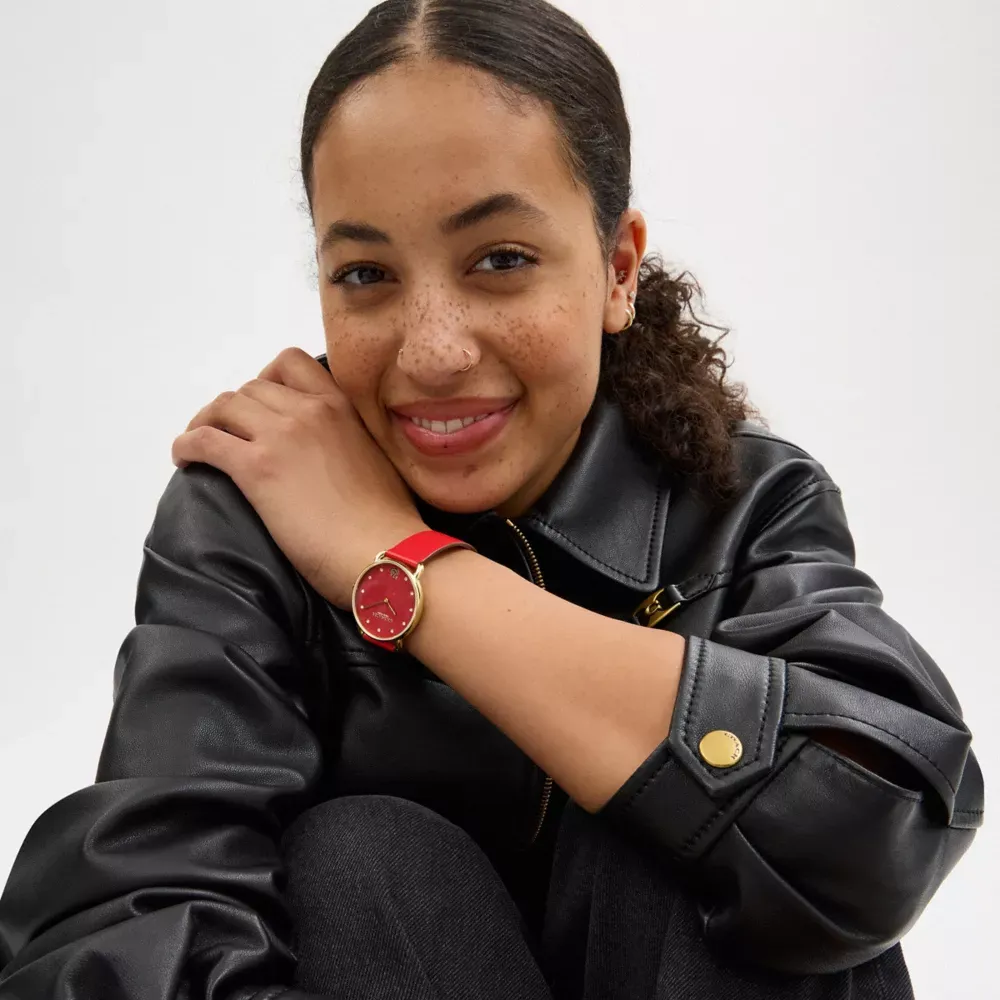 With clean lines and a modern minimalist sensibility, the Elliot is a true design classic ready for workdays and weekends. Celebrate 2025 Year of The Snake with this special New Year gold tone watch designed in a vibrant red hue symbolizing luck, happiness and good fortune. Finished with a leather strap, the gold tone timepiece features a guilloché dial detailed with crystal markers and a playful petite coiled snake gold tone marker at 6 o’clock.