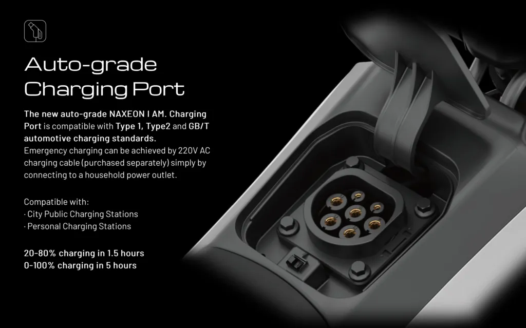 A:For a battery that is completely empty: Charging from charging stations takes 4.5-5 hours. However, depending on circumstances, some households may have a charging time of 5+ hours. From a wall outlet, the charging time can be longer. The charging time for the battery at 220V varies depending on the starting charge level and whether the car is charged from a wall outlet at home or a charging station. Any grounded domestic outlet can be used to charge your NAXEON. However, it is best to have your installation checked by a professional to avoid overloading the circuit. In practice, it is recommended to opt for at least a reinforced outlet, which is very safe and offers higher charging power.