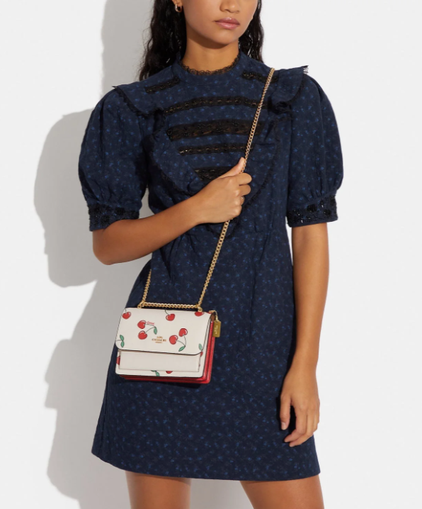 Mini Klare Crossbody With Heart Cherry Print Limited Edition 100% Authentic Product Details Printed coated canvas and smooth leather Inside multifunction and zip pockets Snap closure, fabric lining Outside open pocket Handles convert to shoulder strap with 22" drop 7" (L) x 5 1/4" (H) x 2" (W) Price is firm