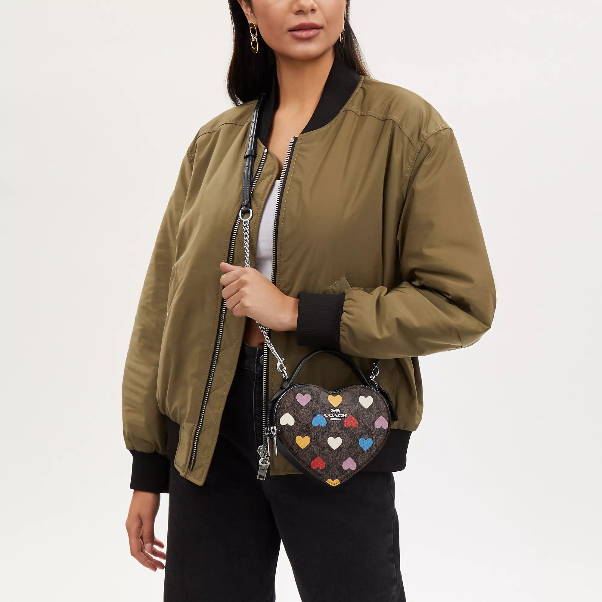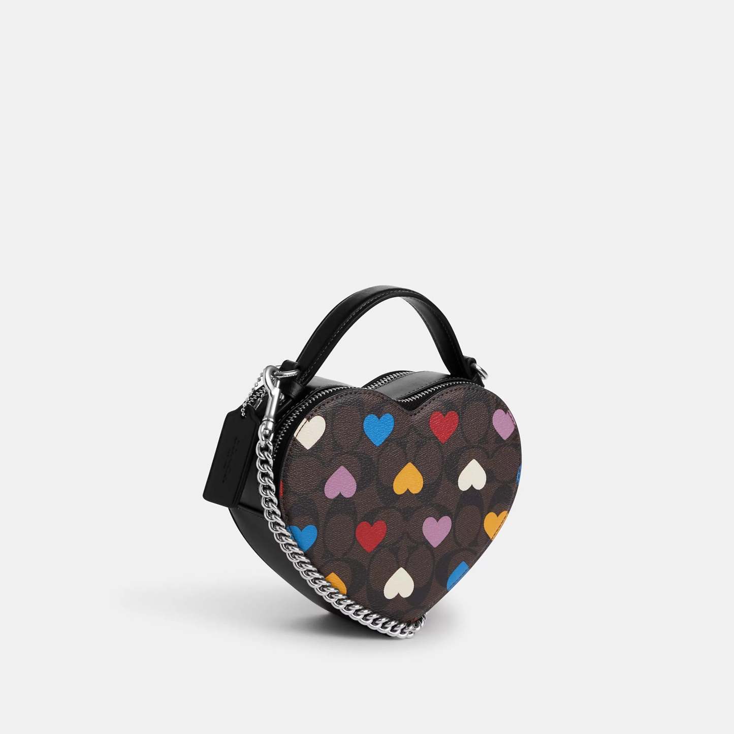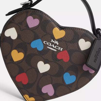 Bestseller Signature coated canvas and smooth leather Two credit card slots Double zip closure fabric lining Top handle with 2 drop Detachable strap with 22 1/2 drop for shoulder or crossbody wear 6 (L) x 7 (H) x 2 1/2 (W) Style No. CP022 | Outlet Heart Crossbody In Signature Canvas With Heart Print - Brown