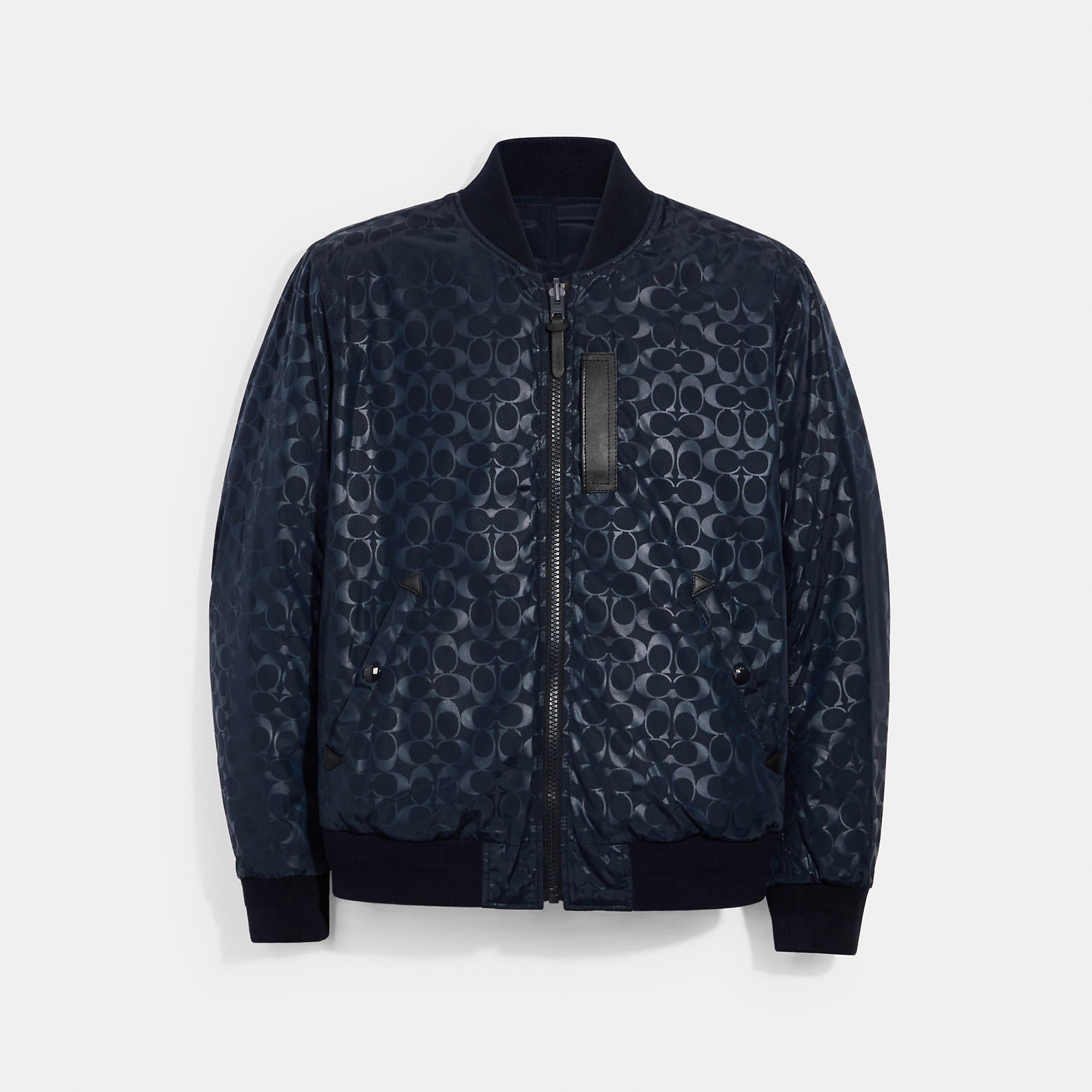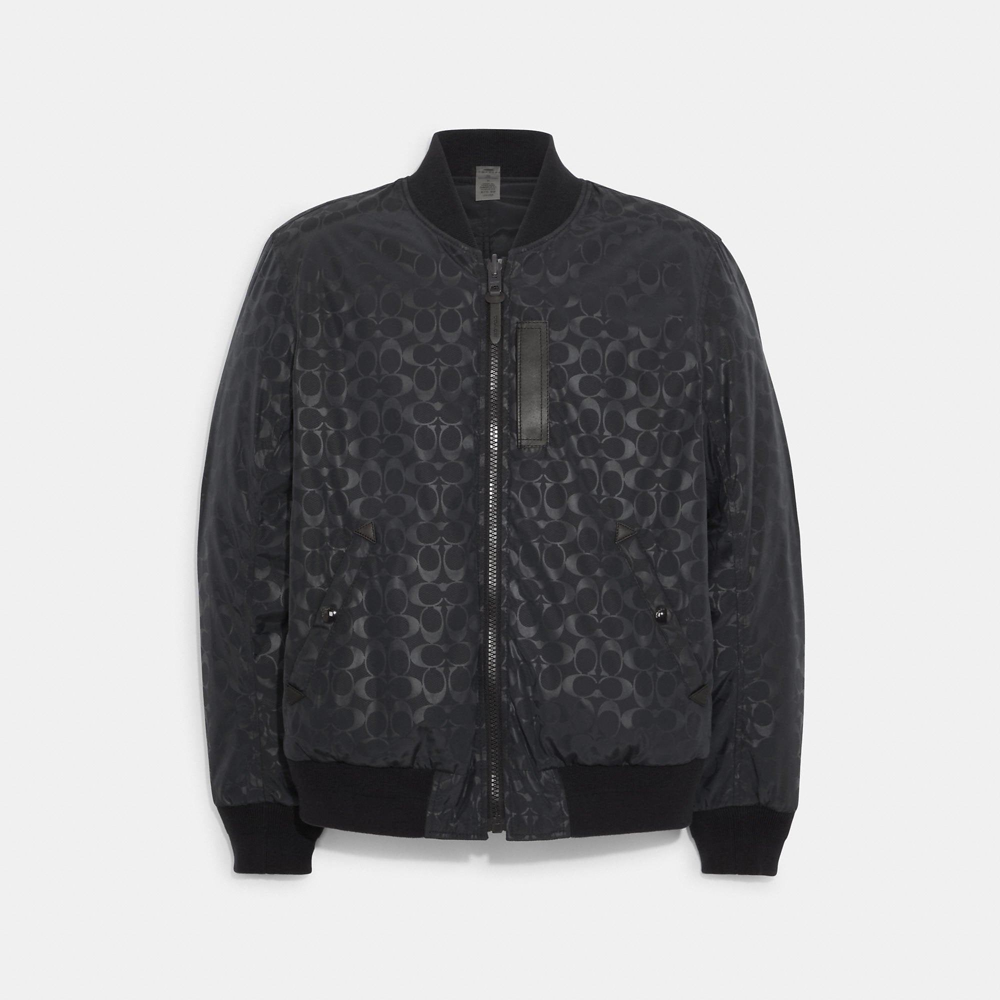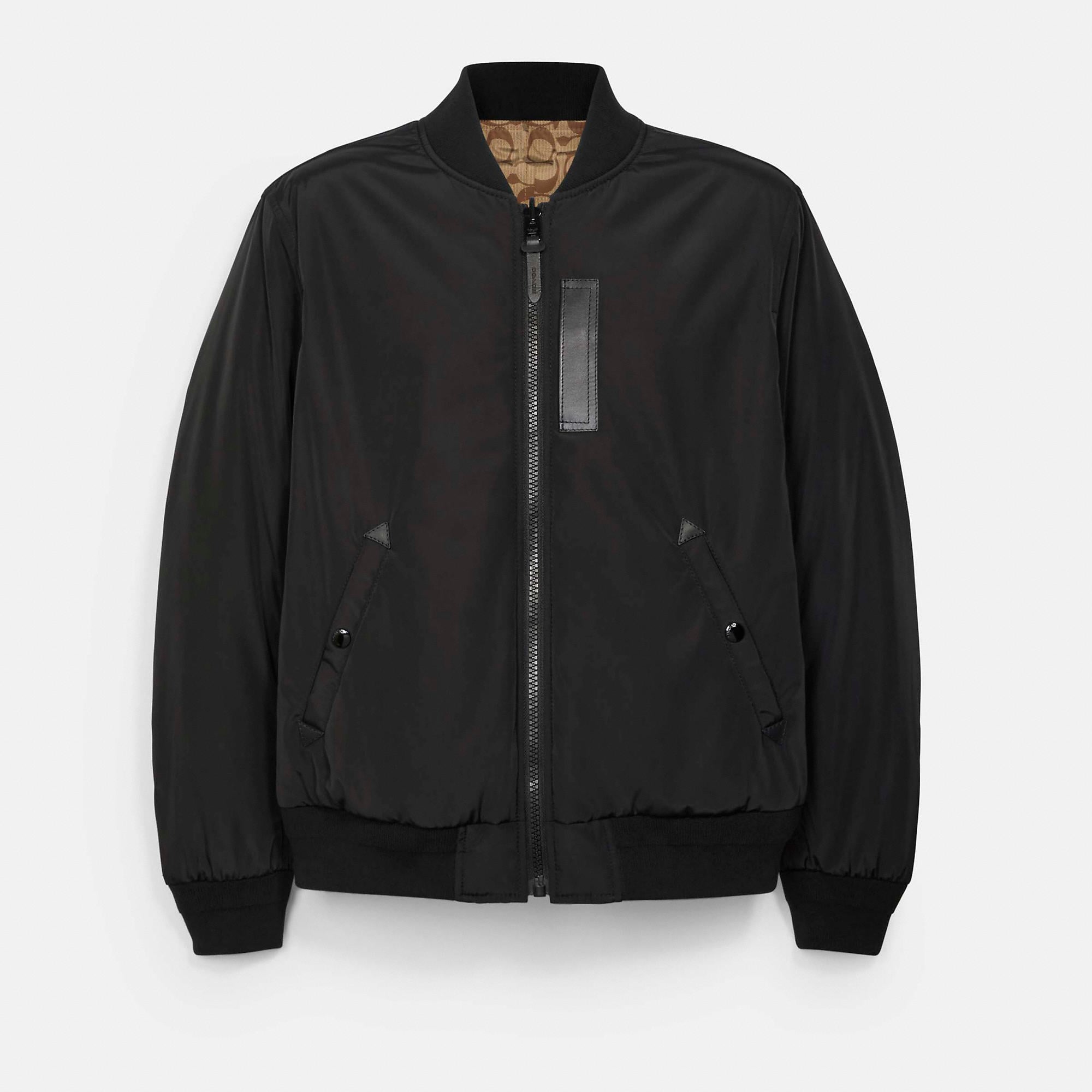 100% polyester Lining - 100% polyester Leather details Zip closure Snap pockets Reversible Water-resistant Length - 27 1/2 Model is 6'2 (188cm) and wears a size M Style No. 3089 | Outlet Reversible Signature Ma 1 Jacket - Blue, Size - X-Large