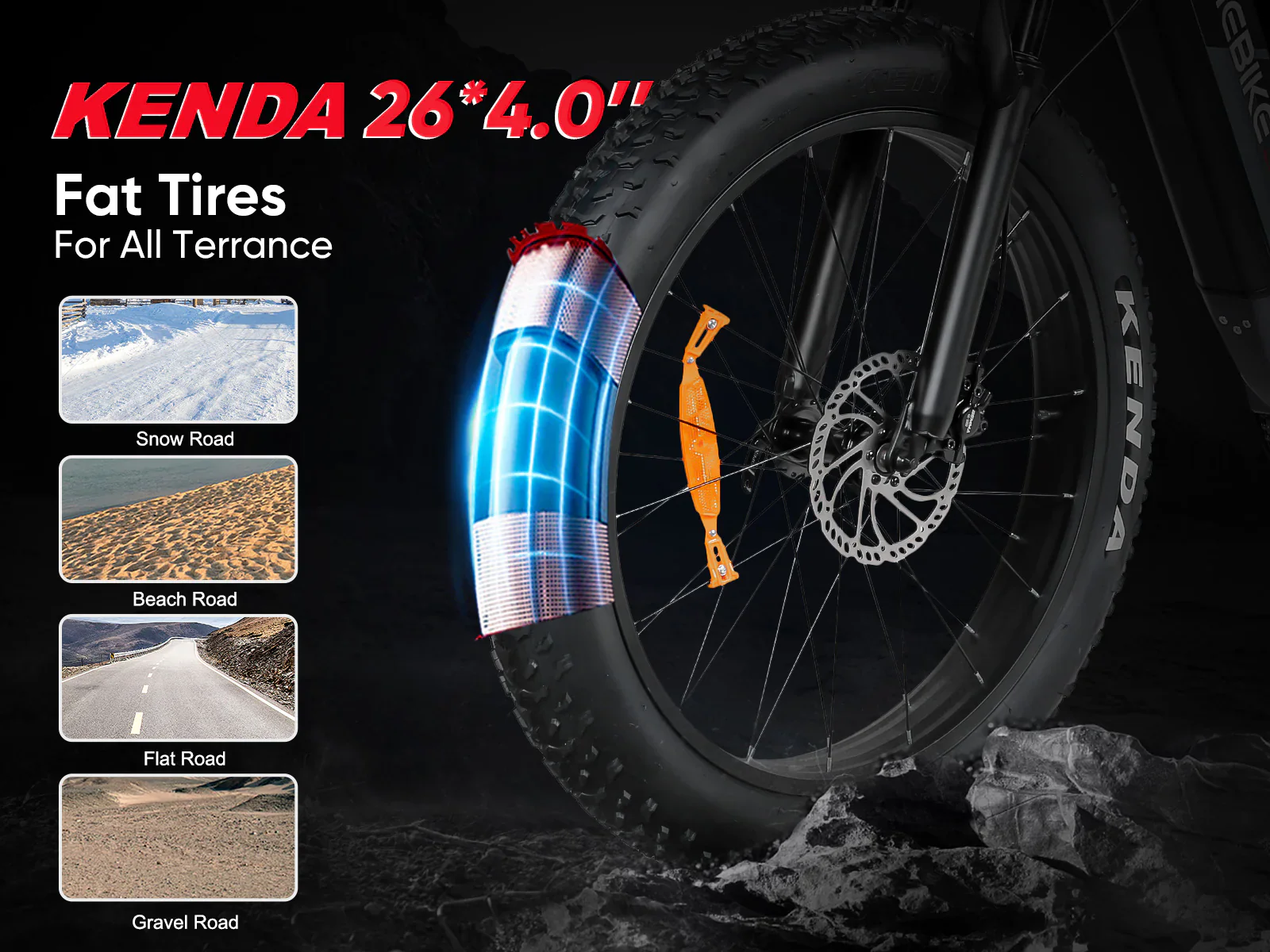 26"*4.0" Puncture-resistant fat tires perform more smooth riding.