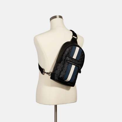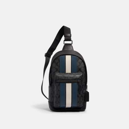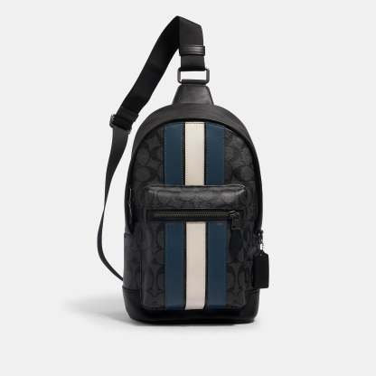 Signature coated canvas and smooth leather Inside multifunction pocket Zip closure fabric lining Outside zip pocket Adjustable shoulder strap for crossbody wear (clip left or right) 7 3/4 (L) x 13 (H) x 3 1/4 (W) Style No. 2999 | Outlet West Pack In Signature Canvas With Varsity Stripe - Black